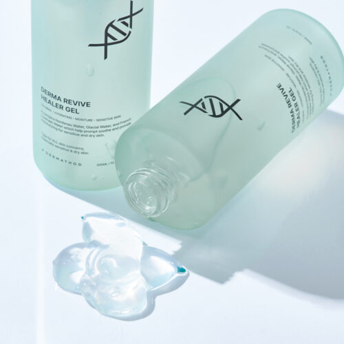 Transparente grünliche Flasche mit Pumpverschluss, gefüllt mit Derma Revive Healer Gel von DERMATHOD – beruhigendes Feuchtigkeitsgel für empfindliche Haut.